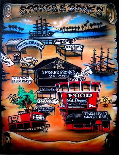 Spokes and Bones is situated on six acres right off of Business 17 in Murrells Inlet, SC. To many it is know as the hidden gem of the Myrtle Beach rallies. From the street view you would never know the expanse of biker fun that lays in wait.